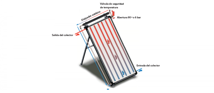 Construido en aluminio anodizado con cobre en la zona de circulación del liquido solar. La longitud se calcula en función del rendimiento del colector. Cada tramo de 1 m disipa hasta 515 vatios. Accesorio obligatorio: válvula de seguridad T/P