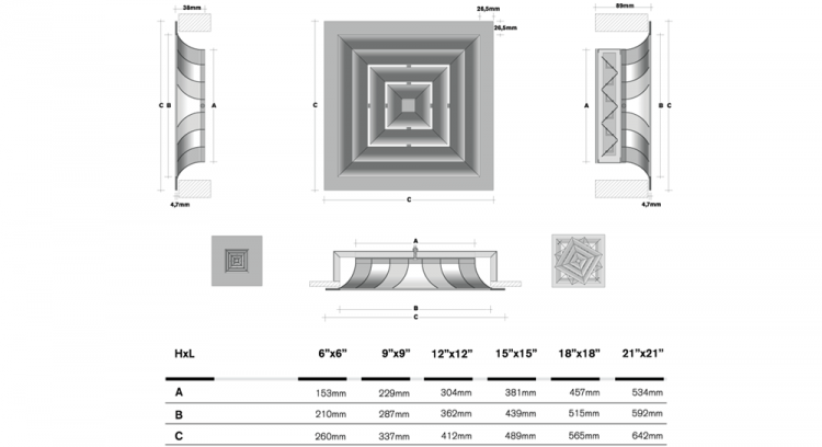 El difusor cuadrado se ha desarrollado para la admisión y expulsión de aire y es adecuado para aplicaciones de aire acondicionado, ventilación y calefacción ya que cuenta con una elevada capacidad de inducción del aire ambiente. La difusión del flujo de aire puede darse de forma simultánea hasta en cuatro direcciones diferentes, en función del número de vías de distribución. Está generalmente indicado para el montaje en techos, adaptándose fácilmente a cualquier ambiente, dado su diseño funcional.
