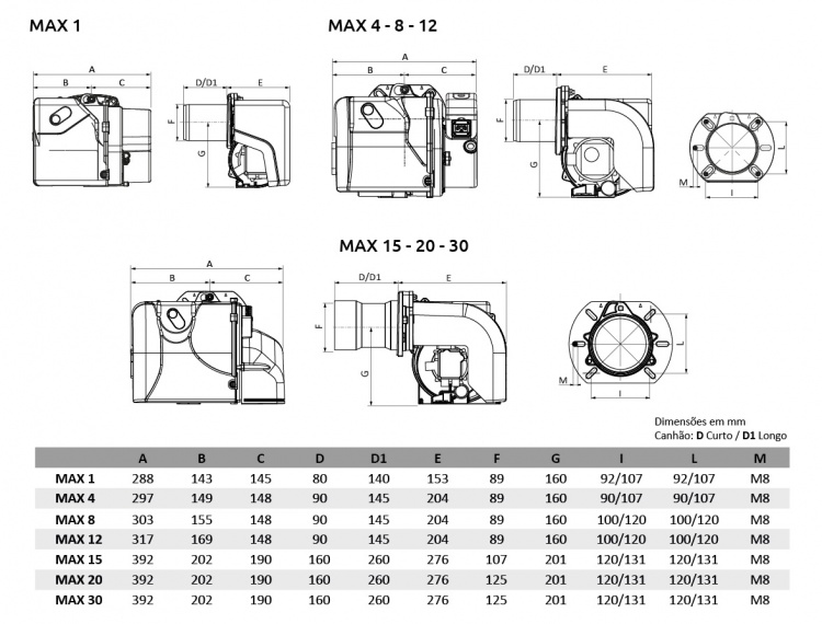 | MAX 15 | Natural | 73 - 190 | 6,2 - 16 | 130 | Classe 2 | 230/50 | 1 Chama |