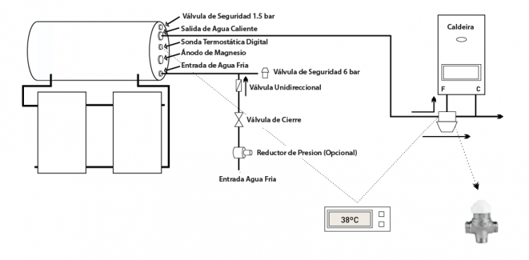 En caso de que la temperatura de las AQS no alcance el mínimo utilizable a través de la energía solar, es posible desviar el agua a través de una válvula desviadora termostática de la salida del acumulador hacia la caldera para que integre el sistema de producción de AQS.