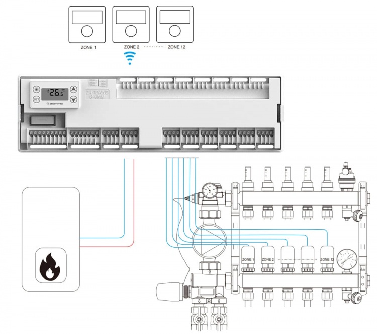 Nova Caixa de Ligações ZSmart com Wireless. Concebida para o controlo de temperaturas, integrando o acionamento das fontes primárias de aquecimento com o controlo da temperatura da água e dispositivos de mistura. Isto garante as melhores condições de conforto possíveis e reduz também o consumo de energia. Possui 8 zonas e pode controlar vários ambientes e divisórias.